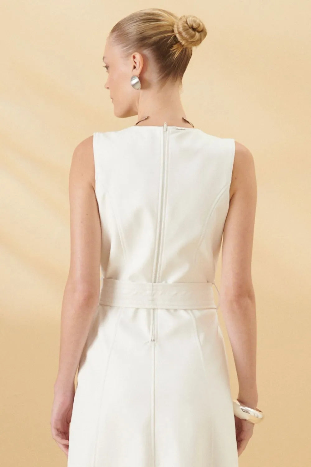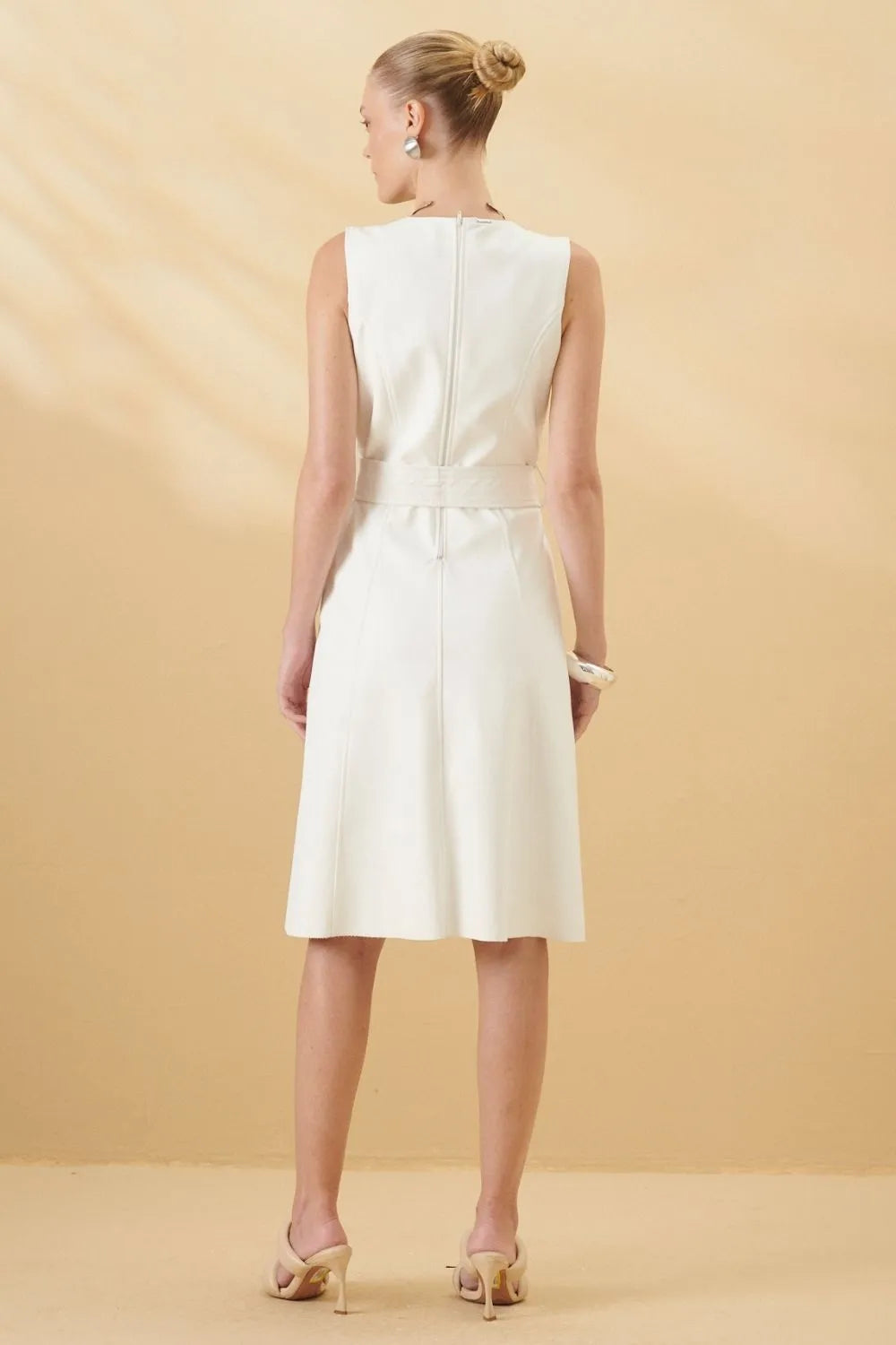 Back zipper close. Belt included