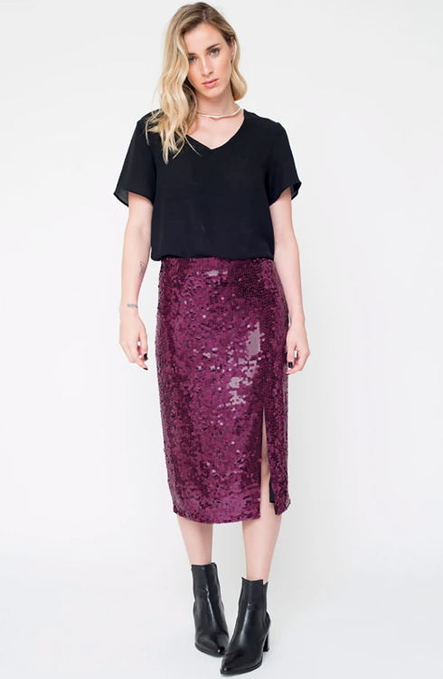 Light fabric midi skirt with same fabric lining, invisible zipper closure on the side. Slit detail on the front of the piece. Manual embroidery on every piece with scaled sequins.